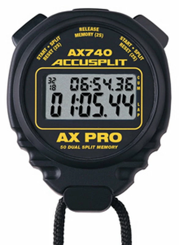 AX 740 AX Pro Memory Series Stopwatches are professional timing devices with significantly increased functionality going beyond our tremendously successful Classic X (WOS) Series. The AX 740 has Exclusive “AOS” 4.5 Operating System with Twin Left-Right button operation feature, designed to give coaches, athletes, and timers the most precise timing available. All AX Pro Series Stopwatches are cased in Accusplit’s distinctive, ergonomic designed “X” Case.