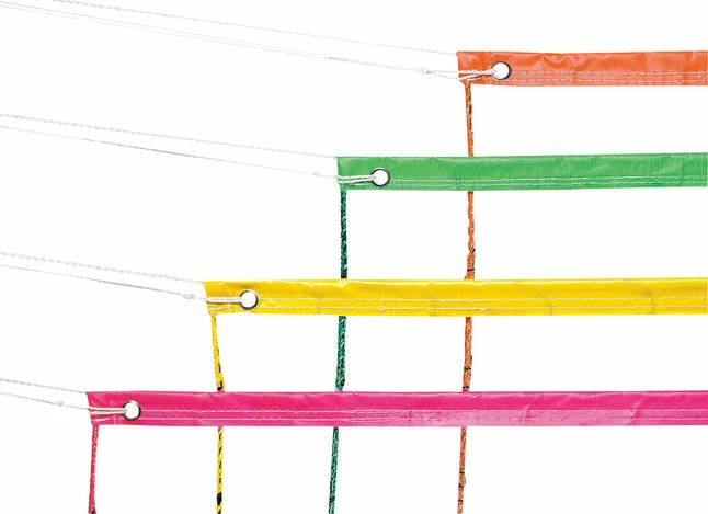 Champion Neon Yellow Volleyball Net, measuring 32 feet x 3 feet x 4 inches, features a 2-1/2 millimeter thick and twisted, durable, square netted polyethylene construction. Net is finished with a taped headband and a rope cable.