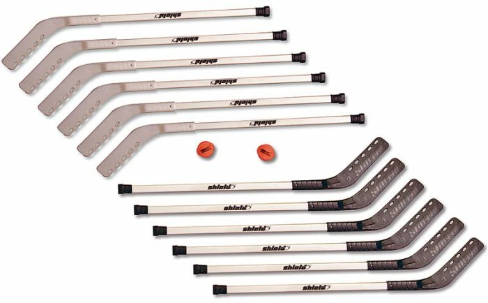 All Shield outdoor hockey sets have extra-thick reinforced outdoor blades for greater durability on concrete and asphalt. Made of patented ABS plastic. 36″ Elementary use. Made in the USA. Each set includes: • 12 sticks (6 w/ black blades) (6 w/ white blades) • 2 speed control balls • instruction booklet